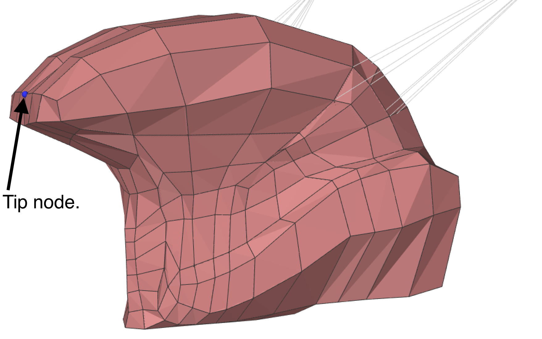The figures below overlay the predictions by the DAE (red points) and the PCA (green points) on top of the ground truth FE model state (as simulated by the ArtiSynth solver). Qualitatively, the DAE reconstructions (red points) better fit the true FE model state as compared to PCA (green points), especially near the most significantly deformed areas.